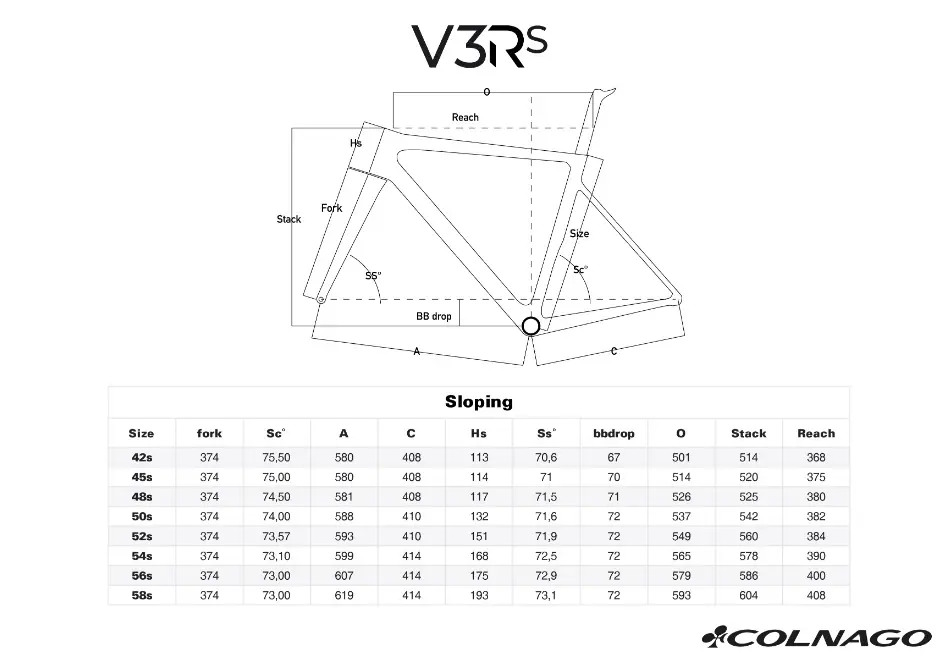 Colnago V3rs The geometry has been overhauled, but it remains race-orientated. Much like the new Scott Addict, the V3r is optimised for 28c tyres (it can apparently squeeze in 30c, although Colnago’s own literature says otherwise), and the geometry and fork have been revamped to retain a race bike fit and feel. For this, the bottom bracket has been lowered and the fork length increased, matched with a shorter head tube. With a sloping geometry, the stack and reach figures are now more linear across the eight frame sizes, as well.